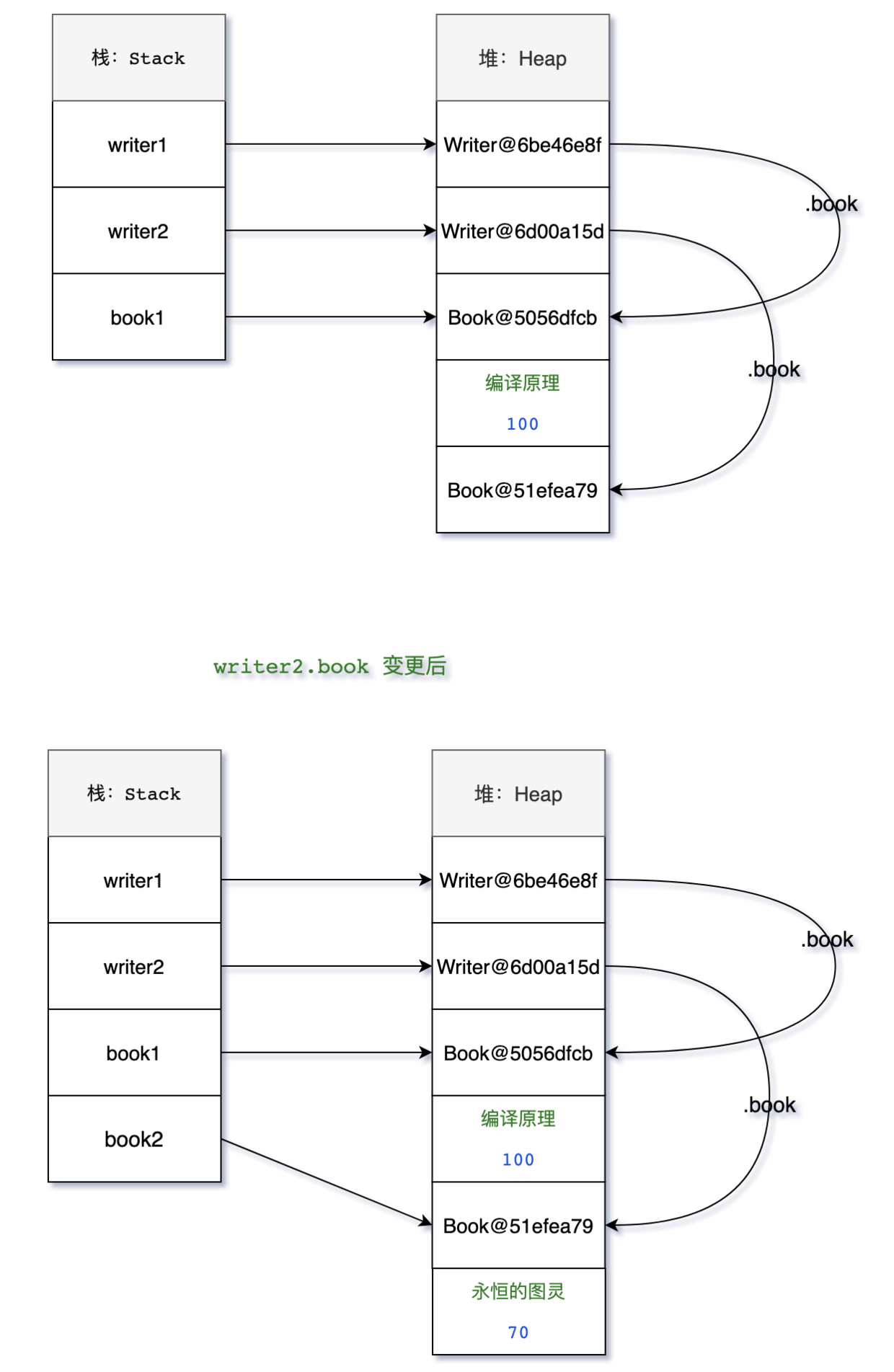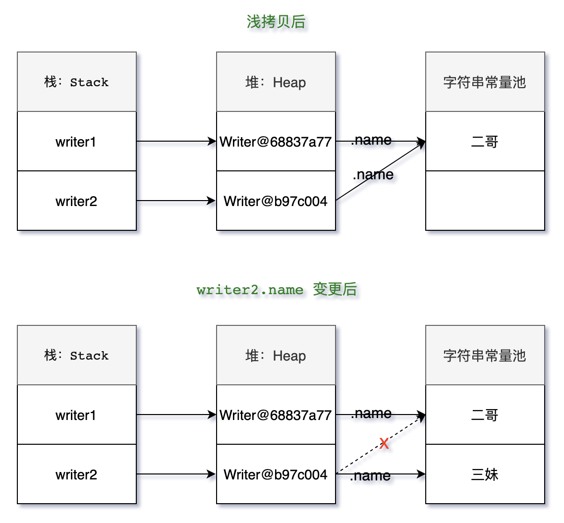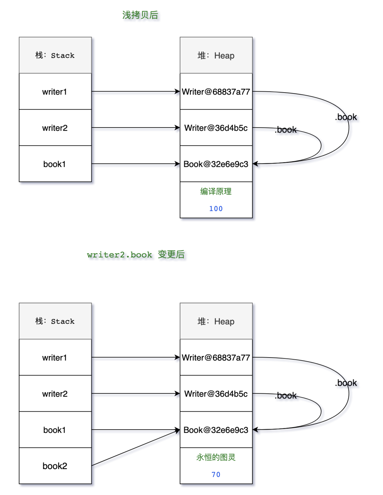 writer2:Writer@36d4b5c age=18, name='二哥', book=Book@32e6e9c3 bookName='永恒的图灵', price=70}}与之前例子不同的是,writer2.book 变更后,writer1.book 也发生了改变。这是因为字符串 String 是不可变对象,一个新的值必须在字符串常量池中开辟一段新的内存空间,而自定义对象的内存地址并没有发生改变,只是对应的字段值发生了改变,见下图。