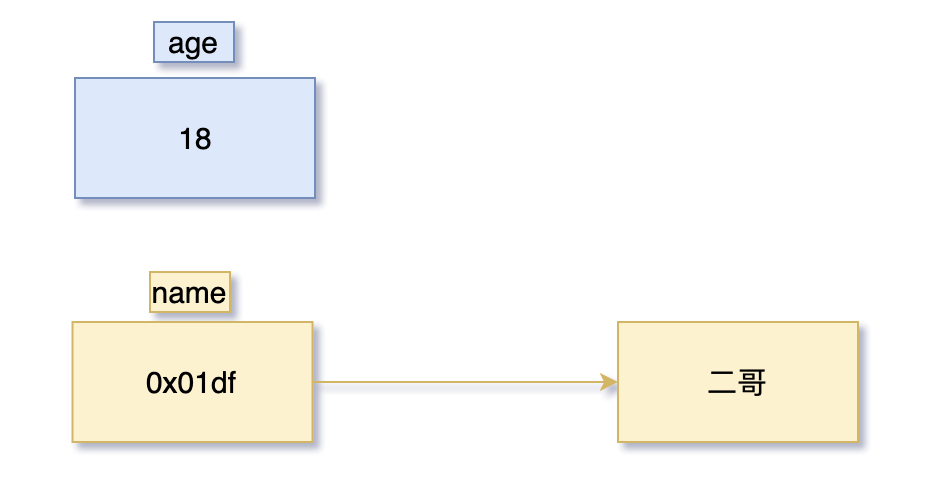 String name = "二哥";age 是基本类型,值就保存在变量中,而 name 是引用类型,变量中保存的是对象的地址。一般称这种变量为对象的引用,引用存放在栈中,而对象存放在堆中。