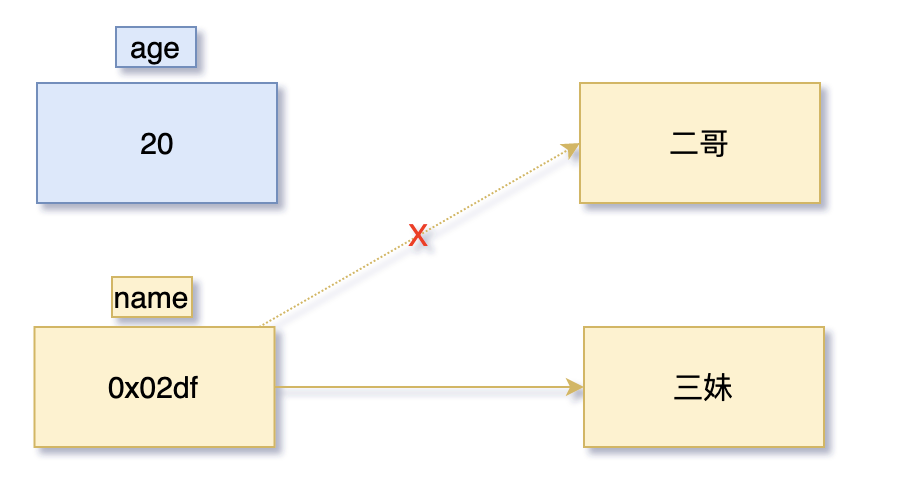 name = "三妹";对于基本类型 age,赋值运算符会直接改变变量的值,原来的值被覆盖。
