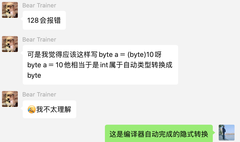 我的回答是编译器帮我们自动做了隐式转换,一个值是 int 类型,但是它的值在 byte 类型的取值范围(-127到 128)内,那么编译器会自动将 int 类型转换为 byte 类型。