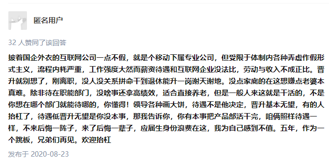 中国移动苏州研究院又叫苏小研,其实犹豫了很久要不要把他放在推荐里。苏小妍在知乎上的争议很大,有说待遇福利很好的,也有狂喷的。苏小研肯定有国企的通病,这个我确认,但具体怎么样就靠大家自己判断了,贴两张知乎上对苏小研的评价,好坏要大家自己去具体确认了。这两张图评价完全是两个极端呀。