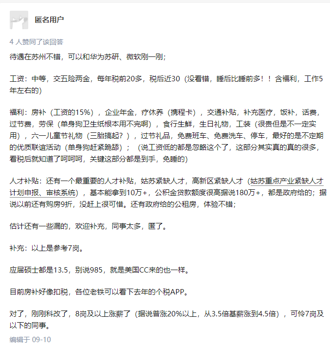 360 来苏州时间不长,2018年才逐渐开始在苏州设立开发部门。目前 360 苏州包含了未来安全研究、360政企、安全等部门。目前 360苏州的薪资水平是北京上海薪资水平的 8 折,看到 21 年毕业的一个应届硕士爆料月薪是 16k,工资有点少,不过感觉在苏州也不错呀。