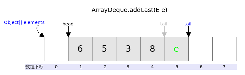 addLast(E e)的作用是在Deque的尾端插入元素,也就是在tail的位置插入元素,由于tail总是指向下一个可以插入的空位,因此只需要elements[tail] = e;即可。插入完成后再检查空间,如果空间已经用光,则调用doubleCapacity()进行扩容。