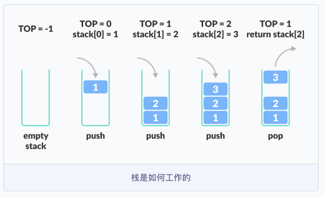 空栈的时候,TOP 等于 -1;把元素 1 压入栈中的时候,stack[0] 为 1,TOP 加 1 变为 0;把元素 2 压入栈中的时候,stack[1] 为 2,TOP 加 1 变为 1;把元素 3 压入栈中的时候,stack[2] 为 3,TOP 加 1 变为 2;把元素 3 从栈中弹出后,返回元素 stack[2],TOP 减 1 变为 1。
