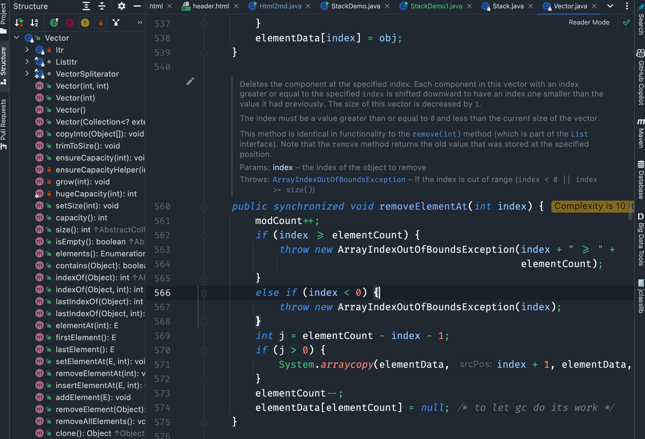 }接着调用 Vector 类的 removeElementAt 方法移除栈顶元素。