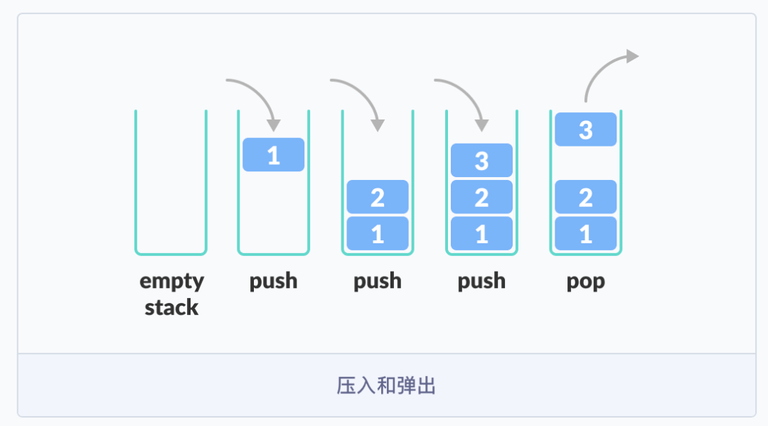 - push,中文释义有很多种,我个人更喜欢叫它“压入”,非常形象。当我们要把一个元素放入栈的顶部,这个动作就叫做 push。