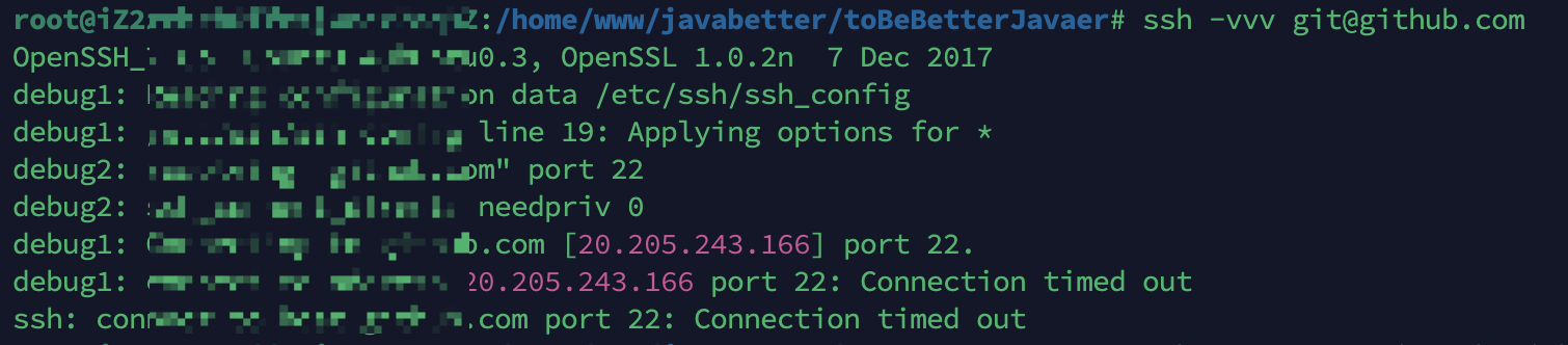 就很奇怪,于是我在 GPT 的帮助下使用 ssh -vvv git@github.com 命令诊断了一下,结果如下所示: