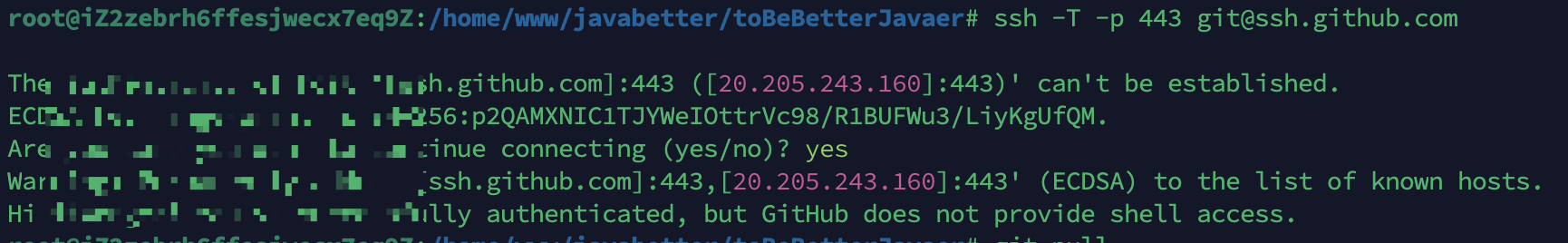 于是我又用这个命令 ssh -T -p 443 git@ssh.github.com 测试了一下,结果如下所示: