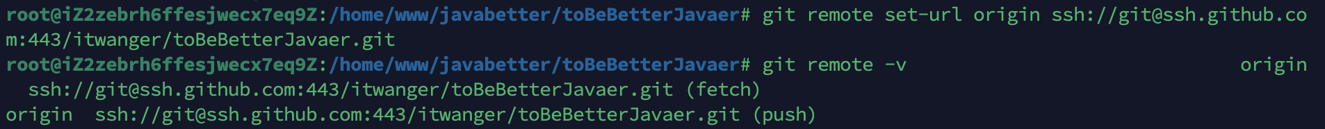 git remote set-url origin ssh://git@ssh.github.com:443/用户名/仓库名.git然后就可以看到端口修改成功了。