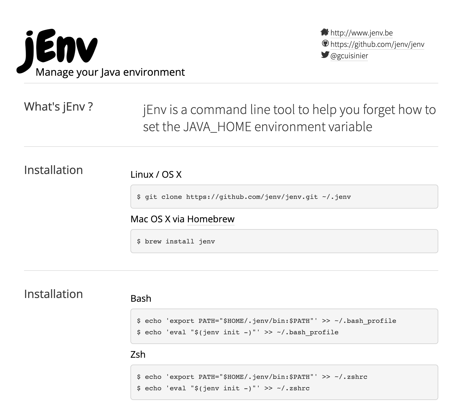 3)但我们在 macOS 上安装了多个版本的 JDK 后,怎么管理它们呢?可以安装一下 jEnv,一个帮助我们管理 JAVA_HOME 的命令行工具,在 GitHub 上已经收获 4.3k 的 star。