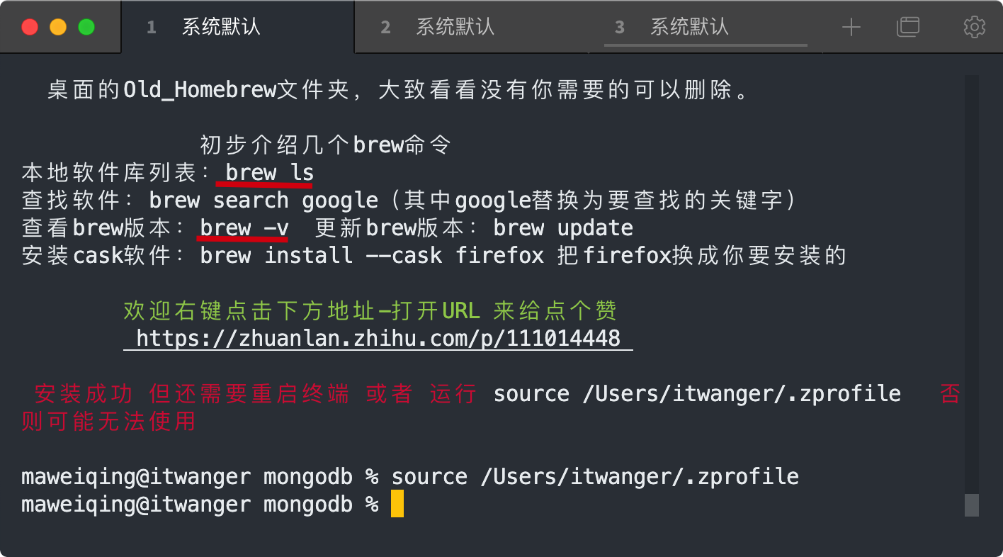 brew ls查看本地命令;brew search mongodb查找软件;brew -v查看版本;brew update更新版本;brew install --cask firefox安装图形化界面软件brew config查看配置。