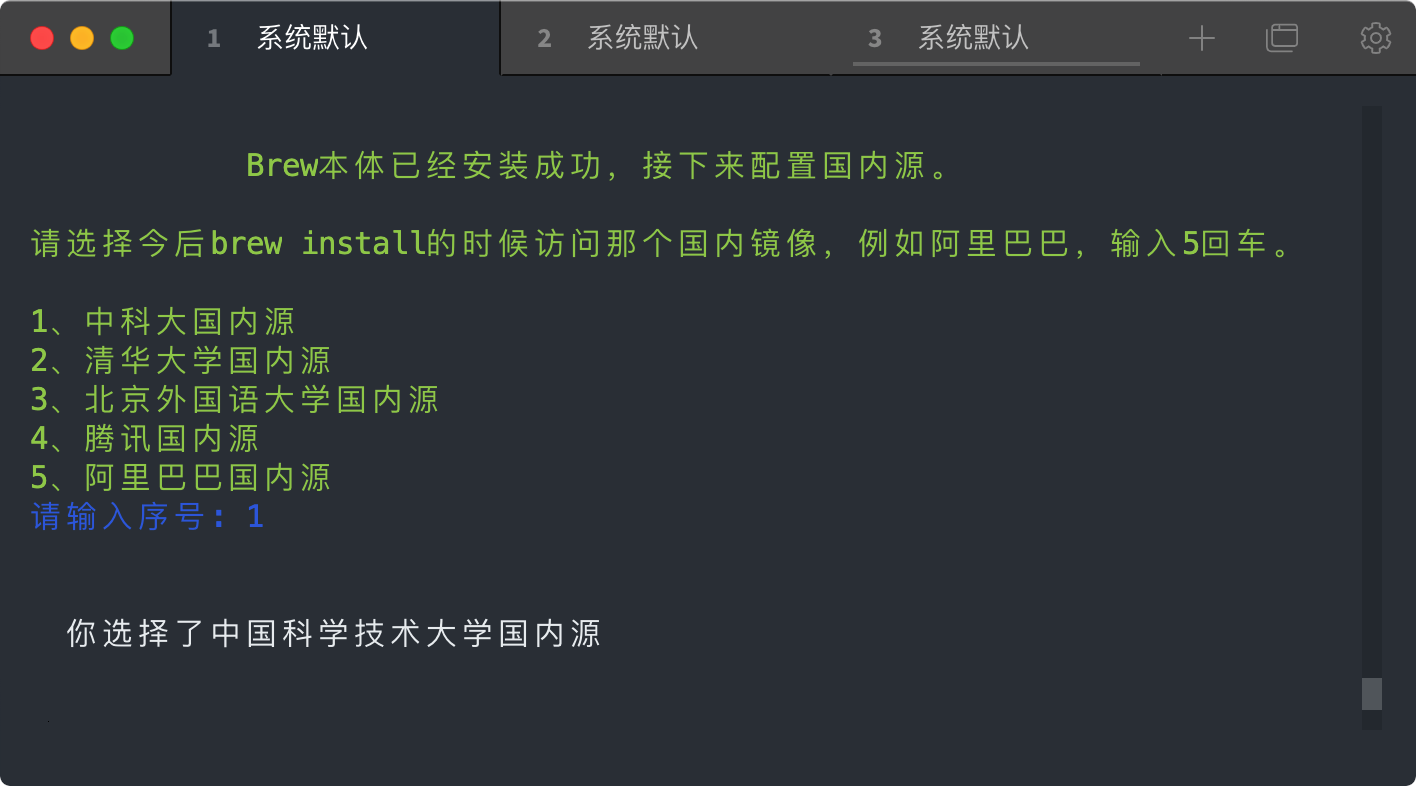 brew 本体安装成功后,会提示我们配置国内镜像源。