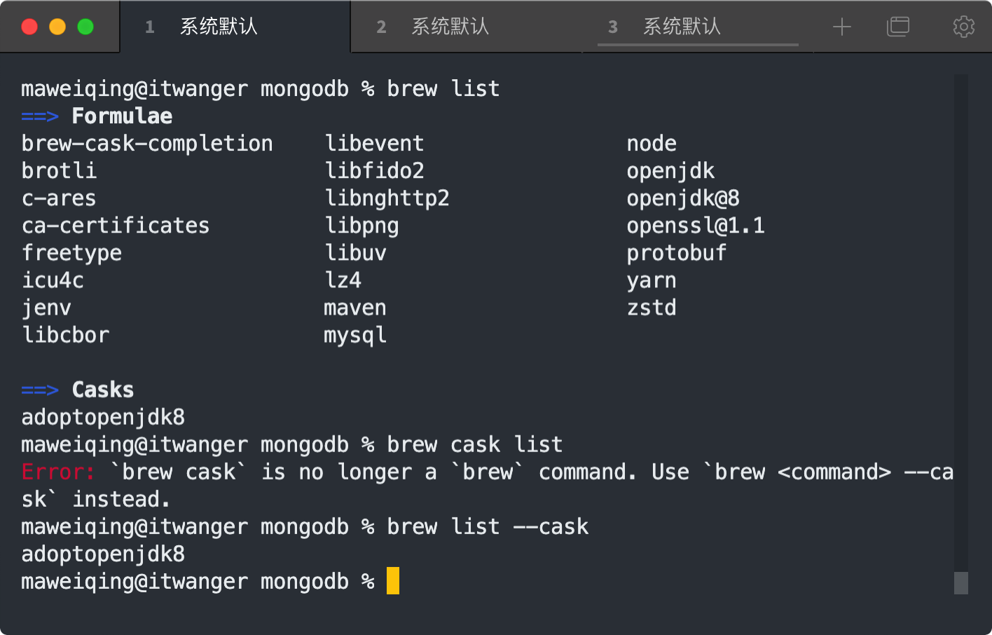 以前的版本中,是可以直接 brew cask list 这样执行命令的,现在改成了 brew list --cask。