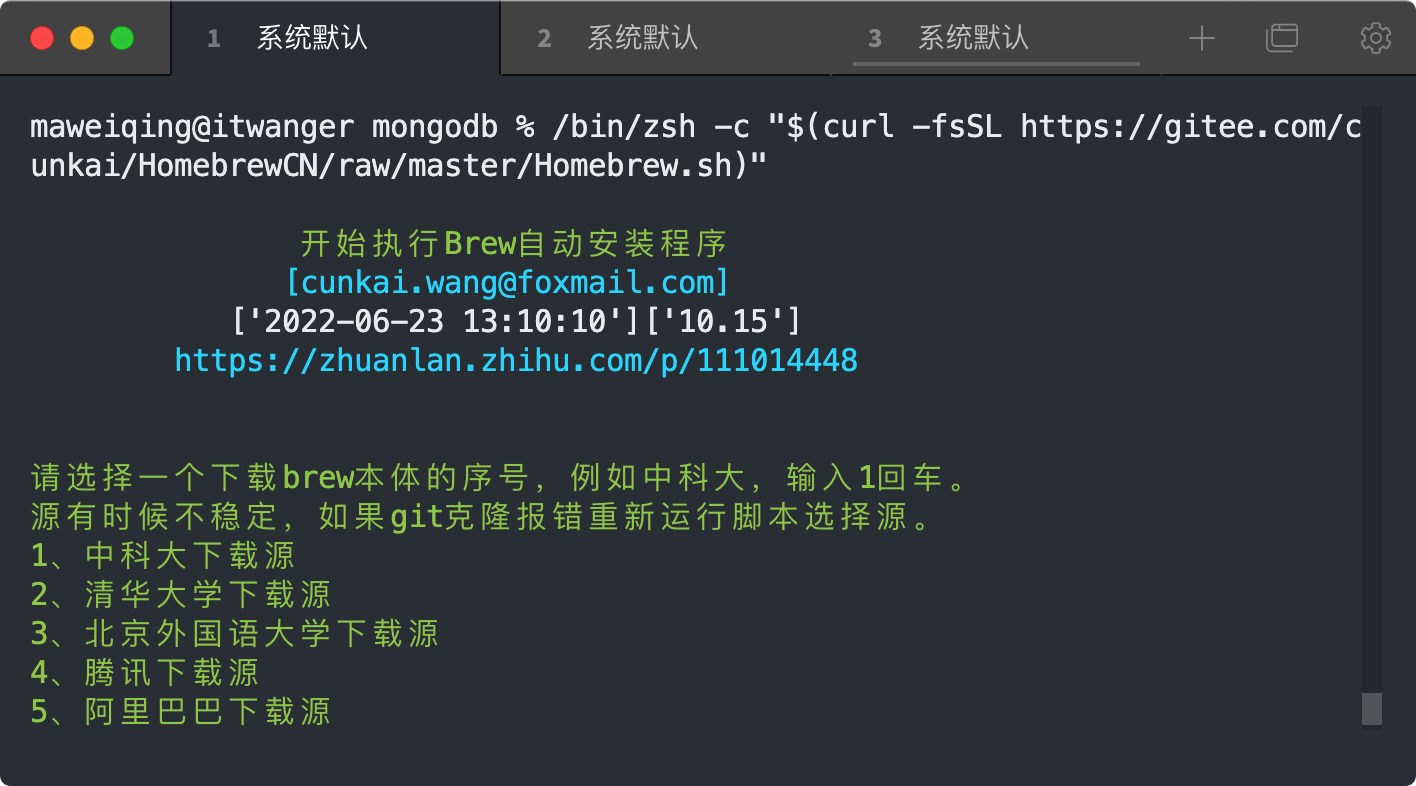 /bin/zsh -c "$(curl -fsSL https://gitee.com/cunkai/HomebrewCN/raw/master/Homebrew.sh)"安装脚本里提供了中科大、清华大学、北京外国语大学、腾讯、阿里巴巴等下载源。