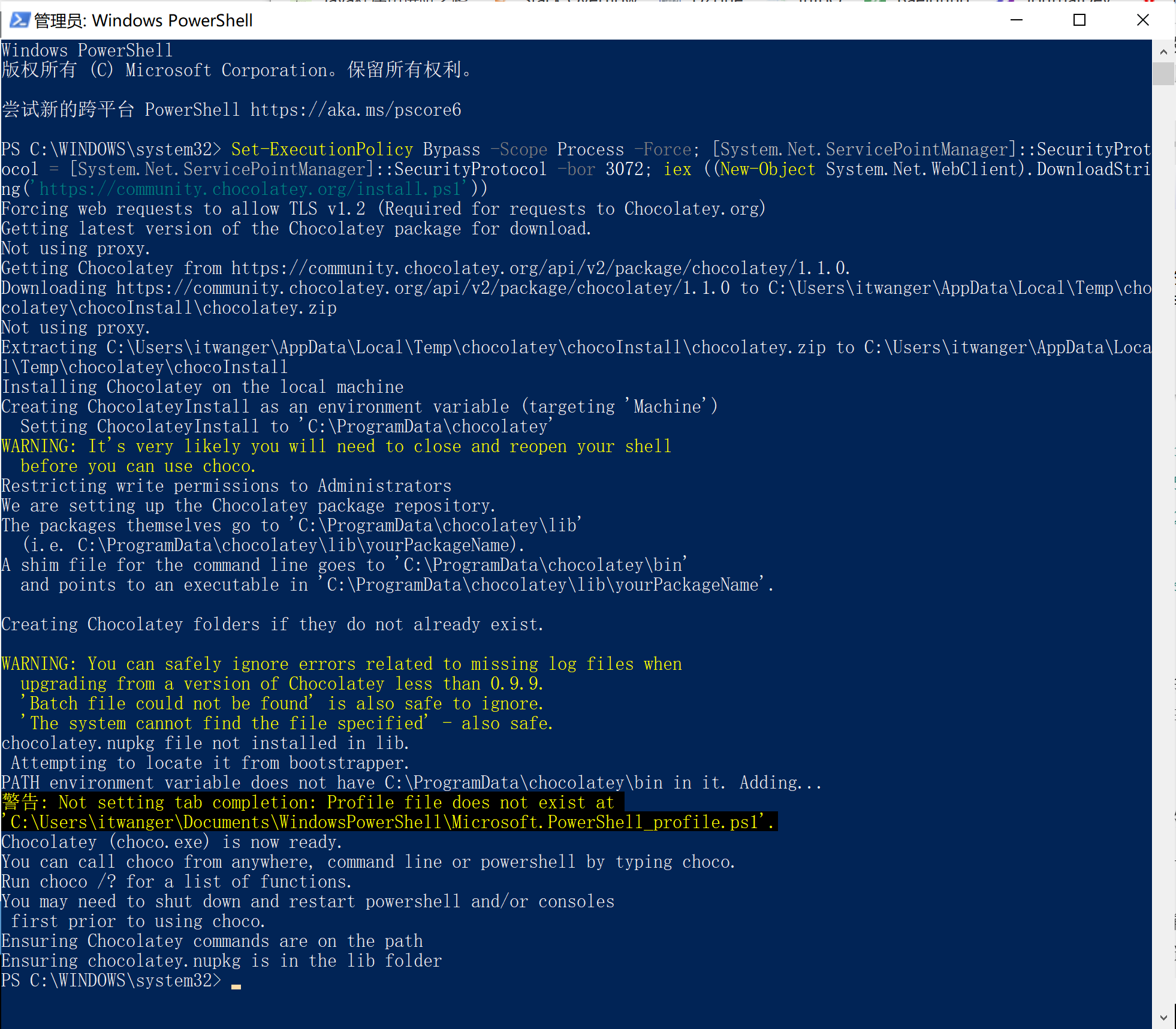 Set-ExecutionPolicy Bypass -Scope Process -Force; [System.Net.ServicePointManager]::SecurityProtocol = [System.Net.ServicePointManager]::SecurityProtocol -bor 3072; iex ((New-Object System.Net.WebClient).DownloadString('https://community.chocolatey.org/install.ps1'))稍等片刻,就完成安装了。