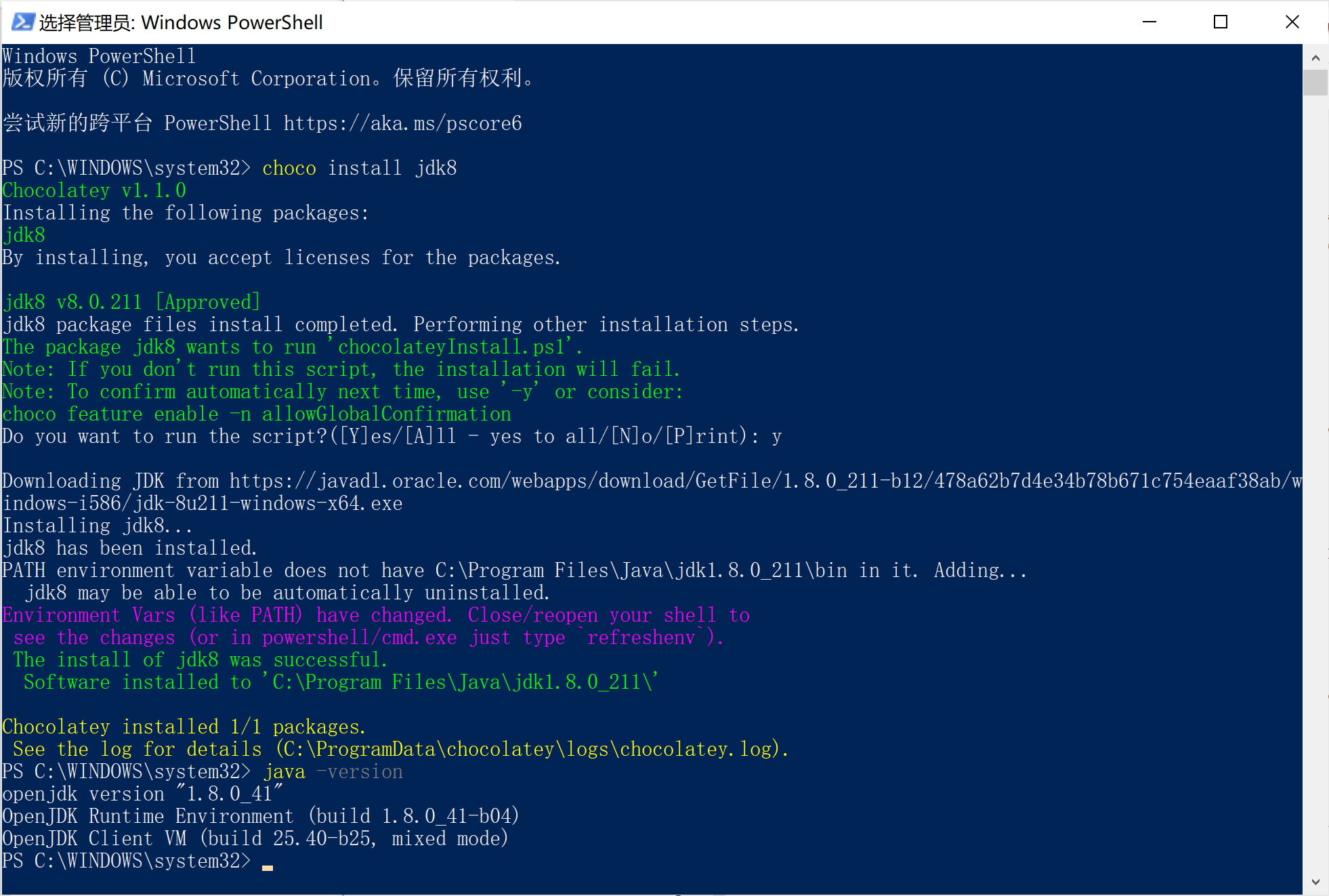 好,现在可以直接在 shell 中键入 choco install jdk8 来安装 JDK8 了,并且会自动将 Java 加入到环境变量中,不用再去「我的电脑」「环境变量」中新建 JAVA_HOME 并复制 JDK 安装路径配置 PATH 变量了,是不是非常 nice?