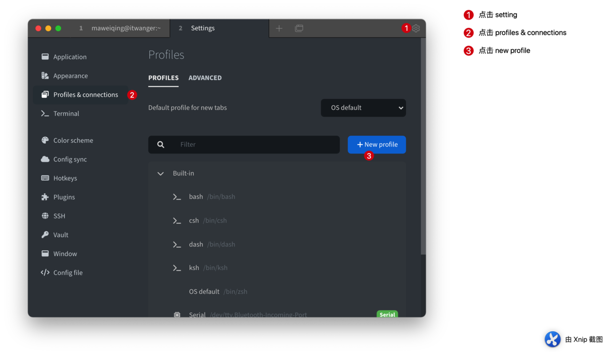 点击「setting」→「profiles & connections」→「new profile」。