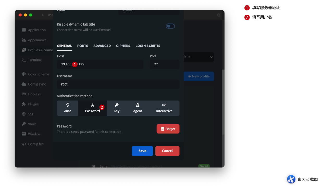 填写服务器的 IP 地址和密码,然后点击「save」。