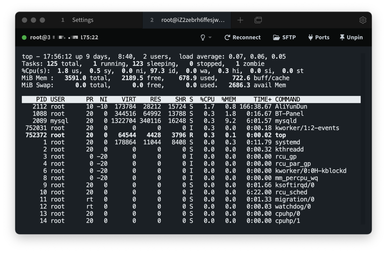 好了,现在可以对服务器进行操作了,执行下 top 命令可以查看服务器上正在运行的进程信息。