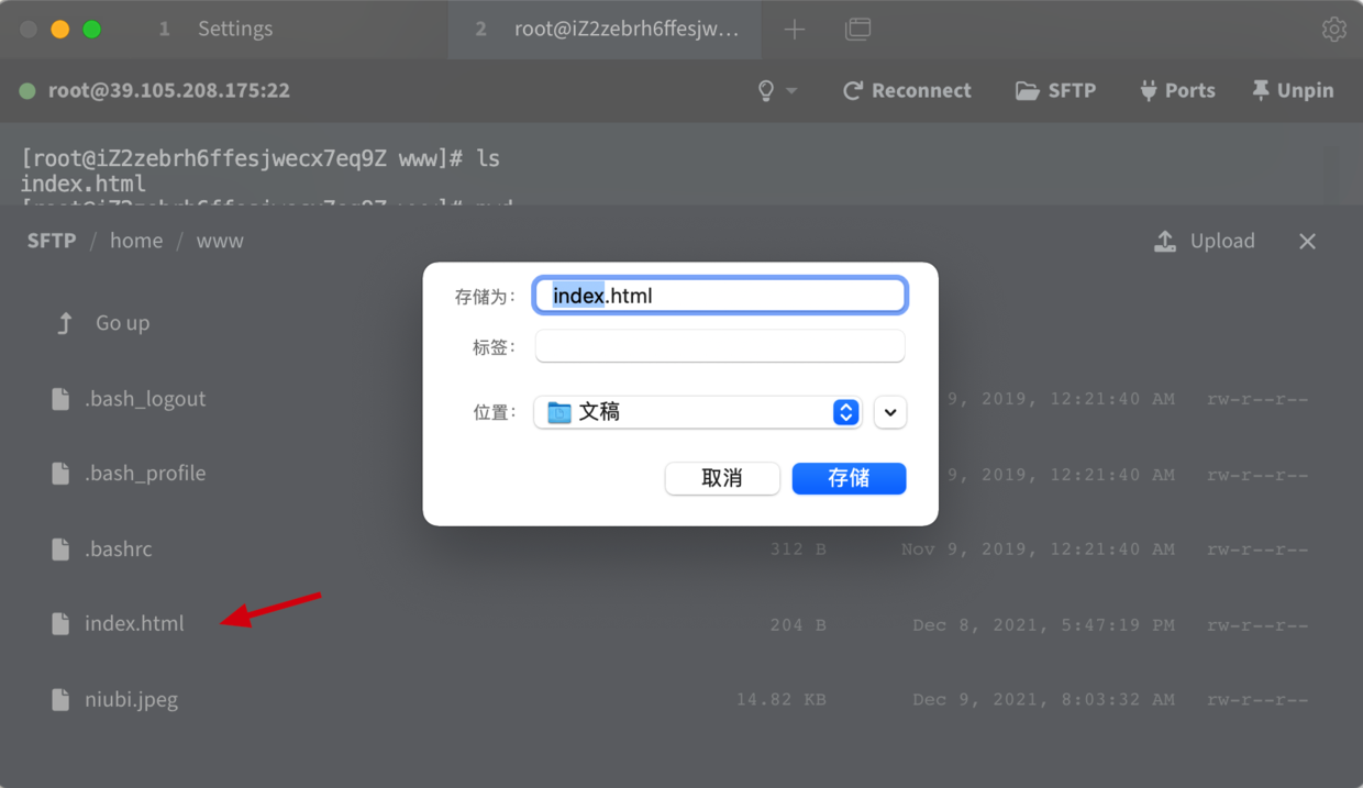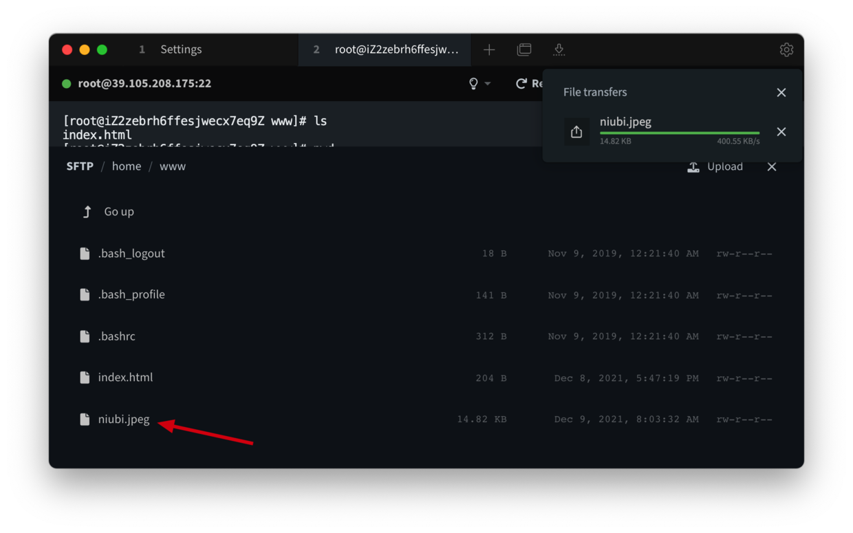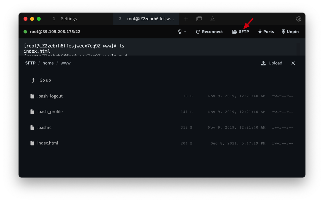 Tabby 集成了 SFTP,所以上传下载文件就变得非常的简单。只需要点击一下「SFTP」图标就可以打开文件传输窗口。