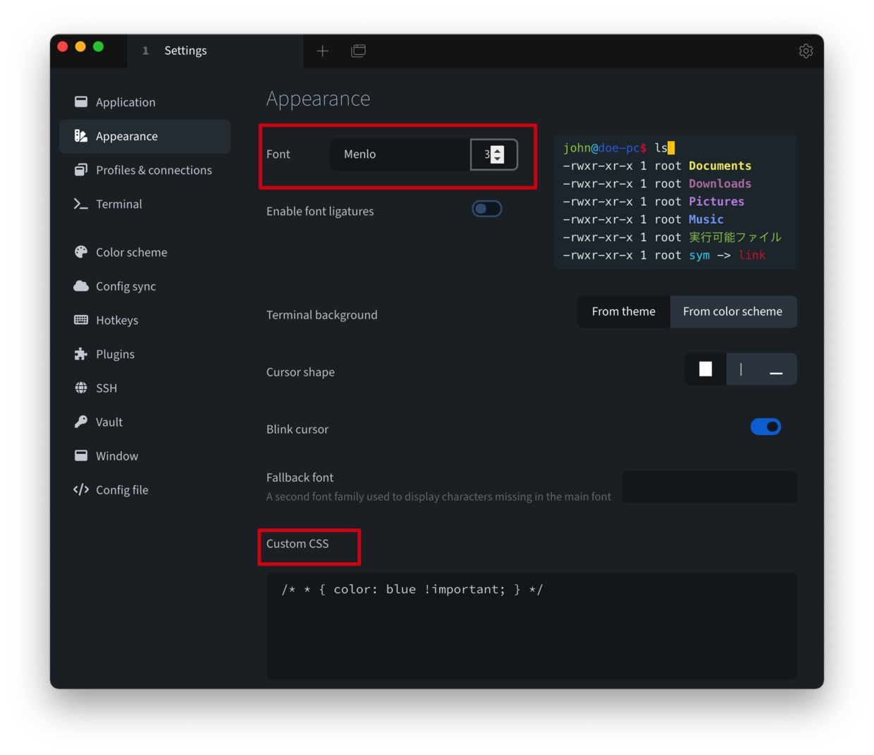 「Settings」 的面板下有一个「Appearance」的菜单,可以对 Tabby 的外观进行设置,比如说调整字体,比如说自定义样式。