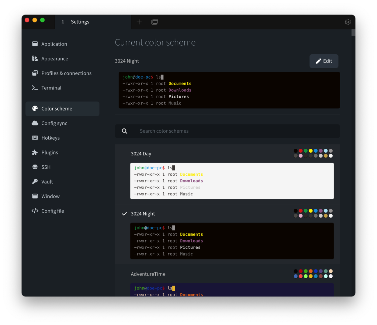 「Appearance」的菜单可以对 Tabby 的配色方案进行修改,里面的主题非常多,不过我感觉默认的就挺不错,毕竟是官方推荐的。