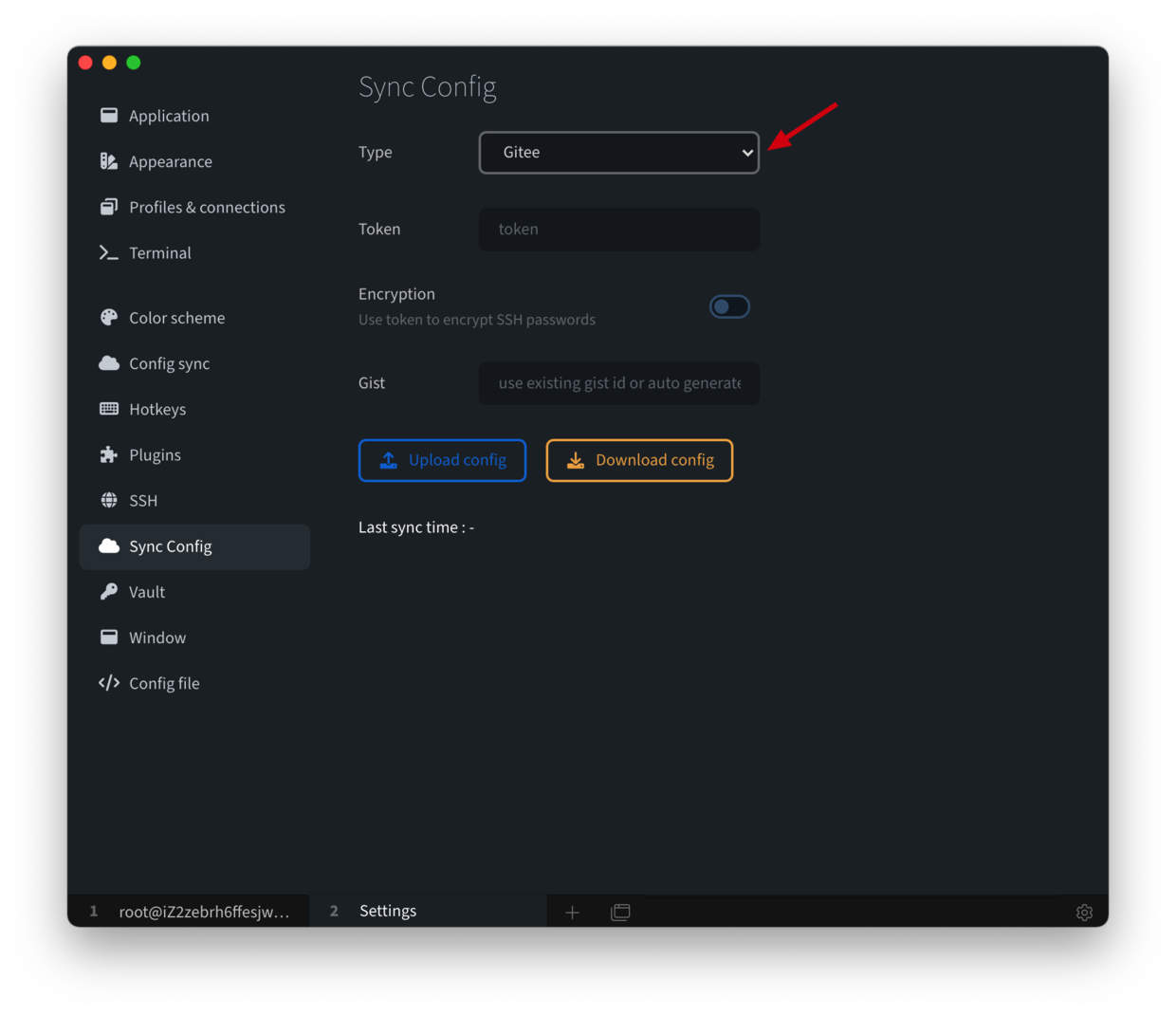 生效后点击「Sync Config」菜单,就可以看到配置项了,类型可以选择 GitHub、Gitee、GitLab。