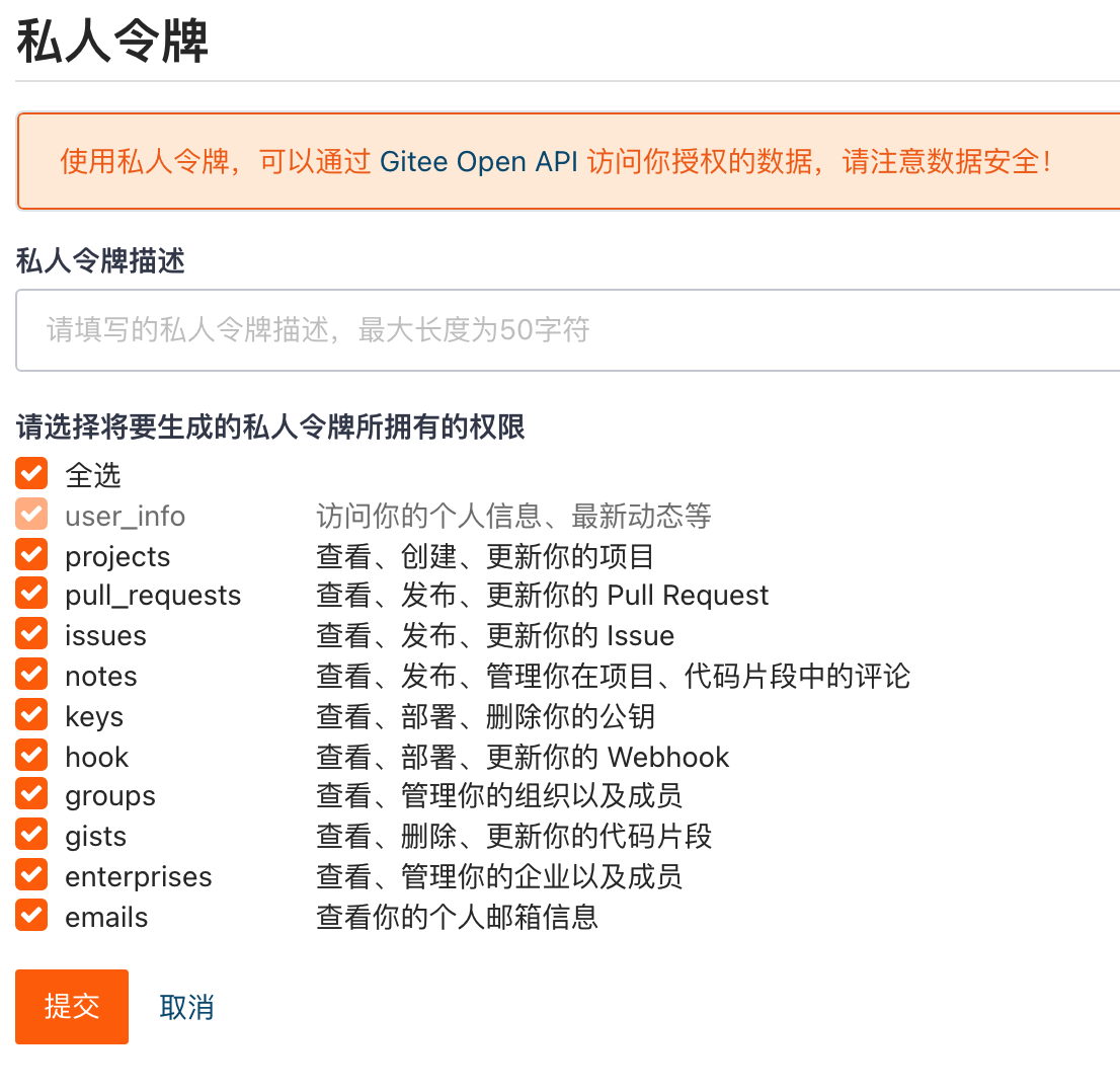 这里以 Gitee 为例,进入个人 Gitee 主页,左侧菜单中选择「私人令牌」,然后点击「生成新令牌」。