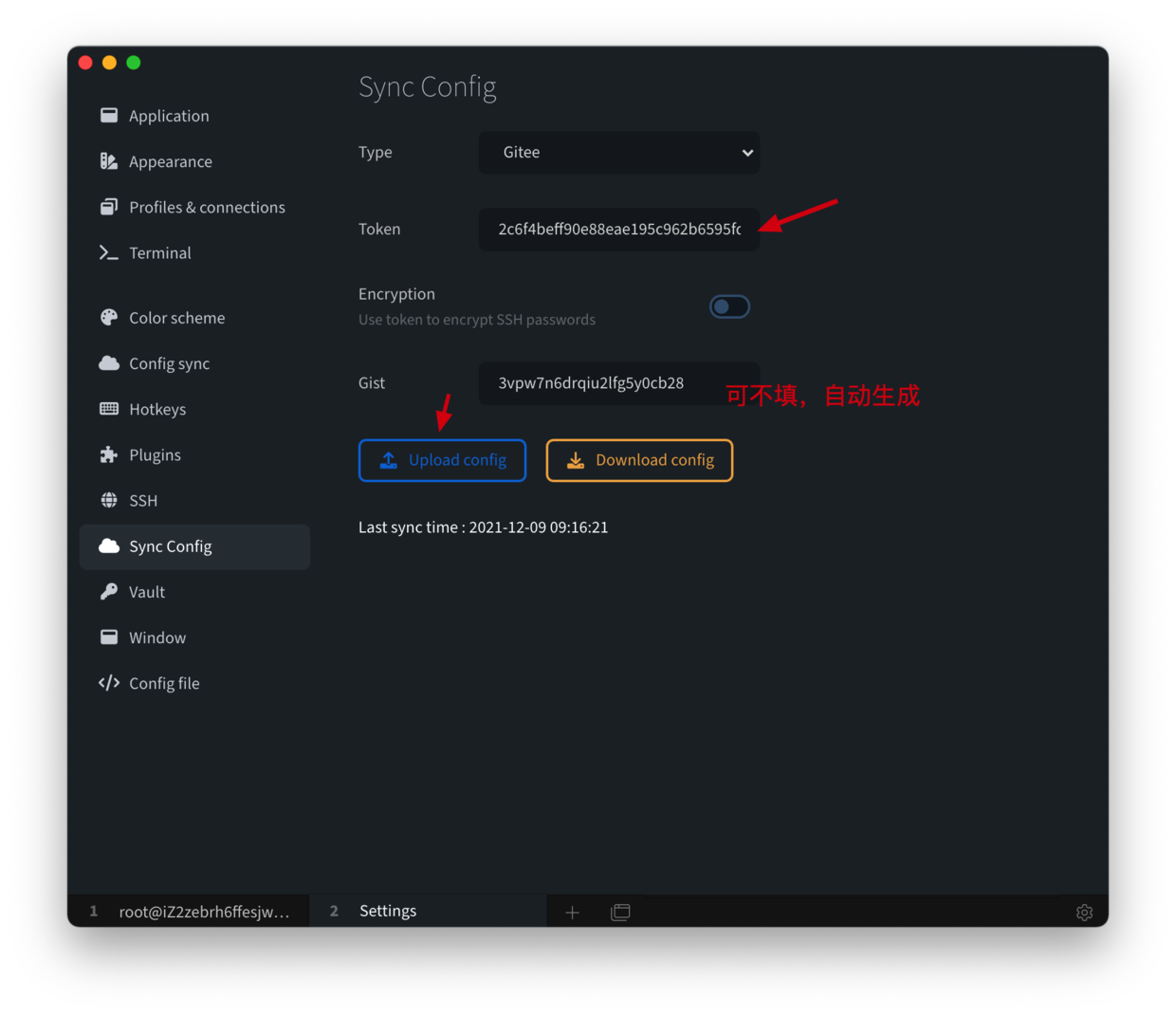 提交后会生成 token,复制到 Tabby 的 Token 输入框中,然后点击「Upload config」,就可以看到配置信息同步成功了。