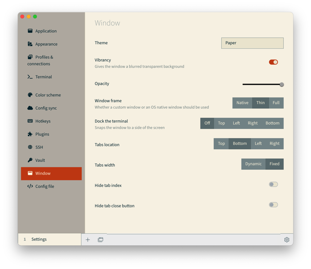 「Window」 菜单中可以对当前窗口进行设置,比如说改变窗口的主题为 Paper,改变 tab 的位置到底部等等。
