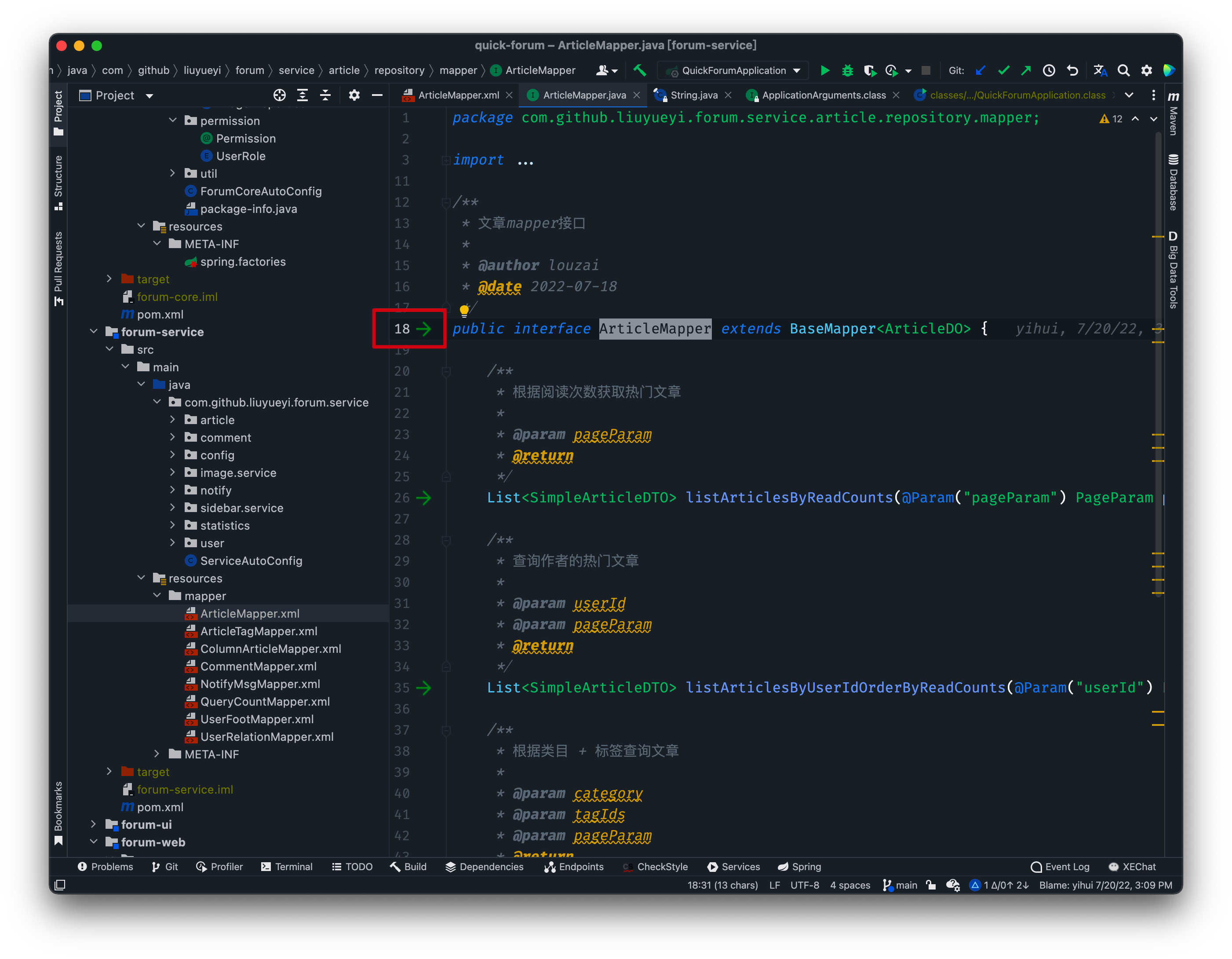 比如,我这里要查看 ArticleMapper 的 xml,那么编辑器的行号右侧就会有一个向右的→,直接点击就跳转过去了。