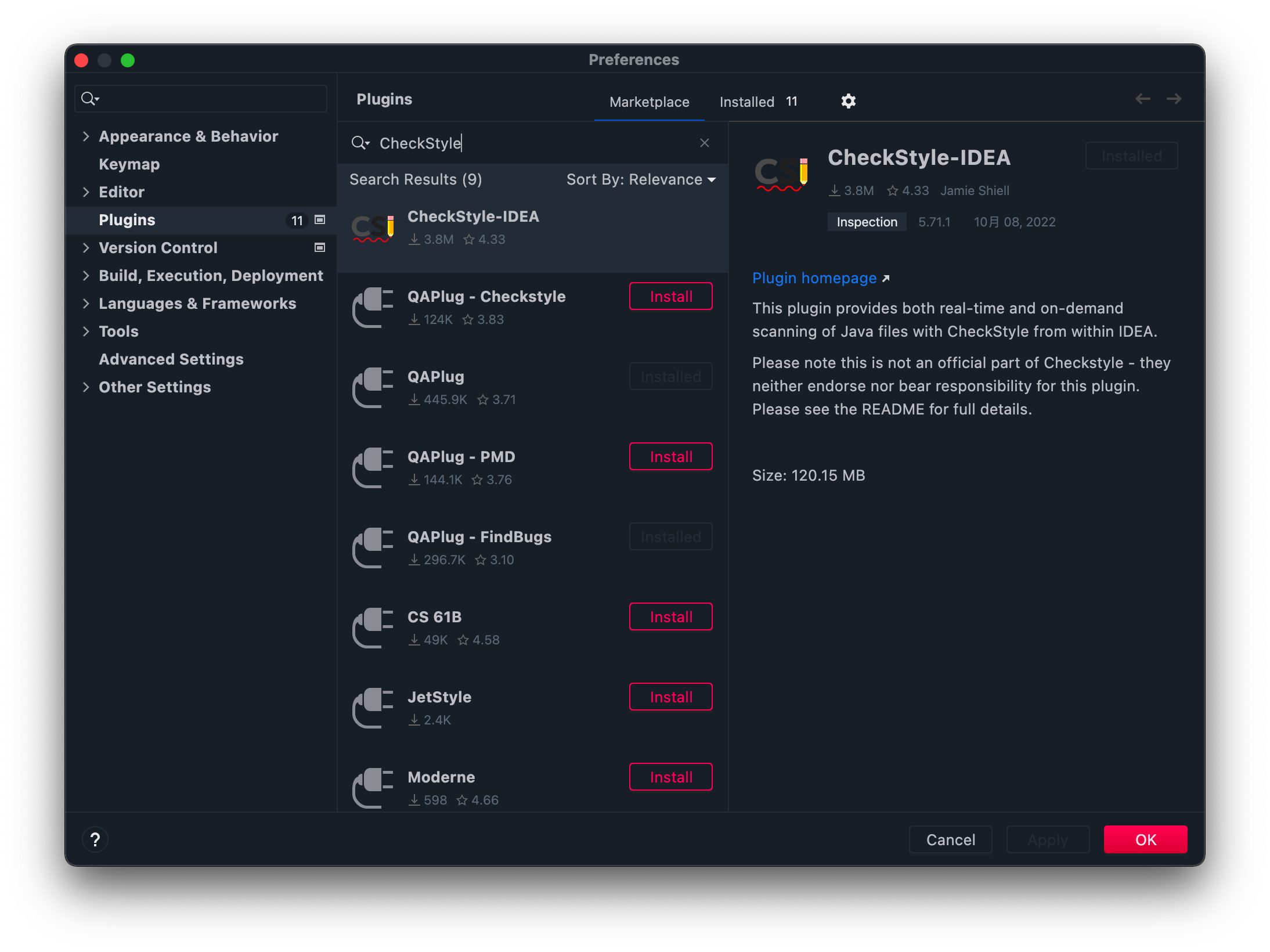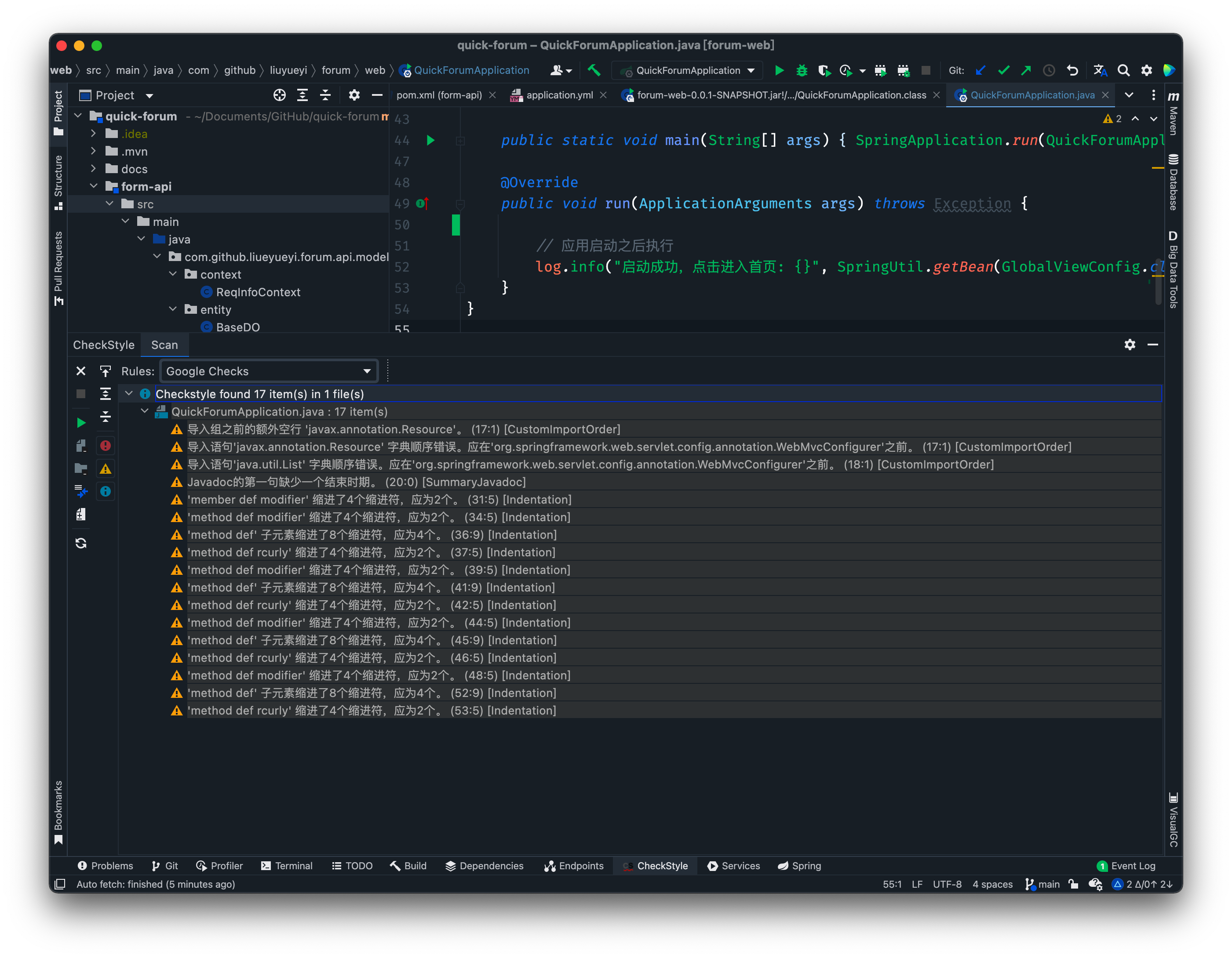 在 CheckStyle 面板中,你可以选择 Google 代码规范或者 sun 的代码规范,跑一遍检查,就可以看到所有的修改建议了。