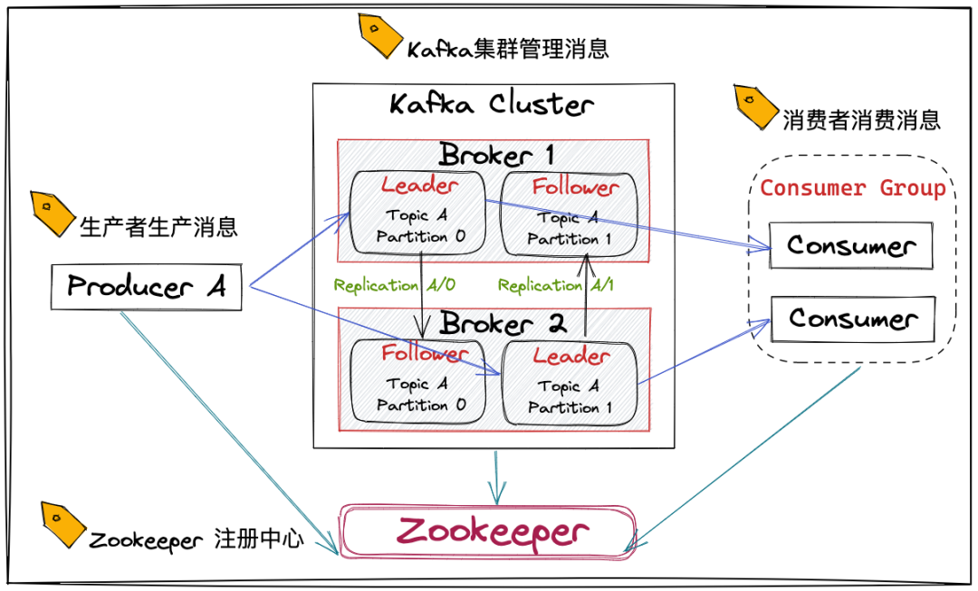 Kafka 是一个使用 Zookeeper 构建的分布式系统。Kafka 的各 Broker 在启动时都要在Zookeeper上注册,由Zookeeper统一协调管理。如果任何节点失败,可通过Zookeeper从先前提交的偏移量中恢复,因为它会做周期性提交偏移量工作。同一个Topic的消息会被分成多个分区并将其分布在多个Broker上,这些分区信息及与Broker的对应关系也是Zookeeper在维护。