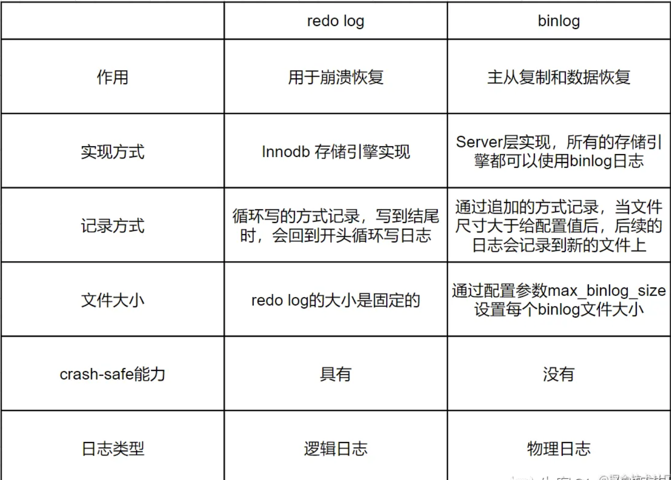 redo log 和 binlog 有一个很大的区别就是,一个是循环写,一个是追加写。也就是说 redo log 只会记录未刷盘的日志,已经刷入磁盘的数据都会从 redo log 这个有限大小的日志文件里删除。binlog 是追加日志,保存的是全量的日志。