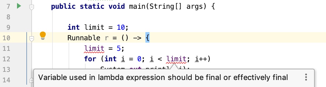 和匿名内部类一样,不要在 Lambda 表达式主体内对方法内的局部变量进行修改,否则编译也不会通过:Lambda 表达式中使用的变量必须是 final 的。