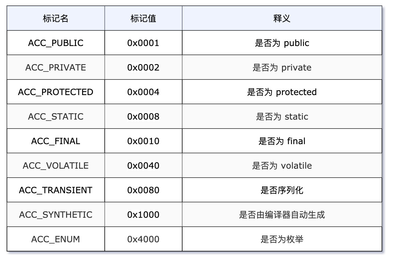 flags: (0x0002) ACC_PRIVATE表明字段的访问权限修饰符为 private,类型为 int,名称为 age。字段的访问标志和类的访问标志非常类似。