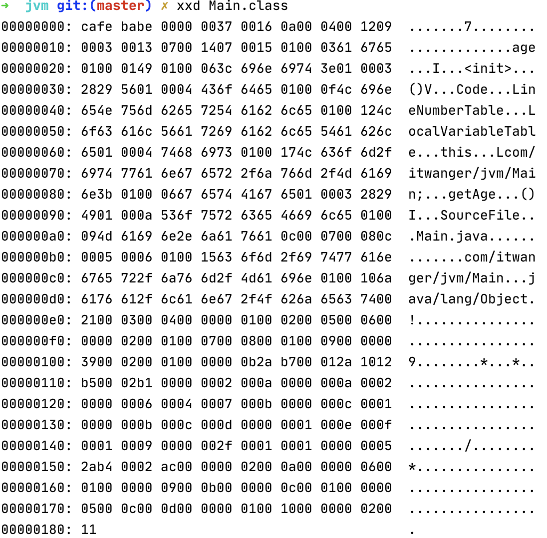 }编译生成 Main.class 文件后,可以在命令行使用 xxd Main.class 打开 class 文件(前面我们已经讲过了,还不会用的同学可以回头看一眼)。