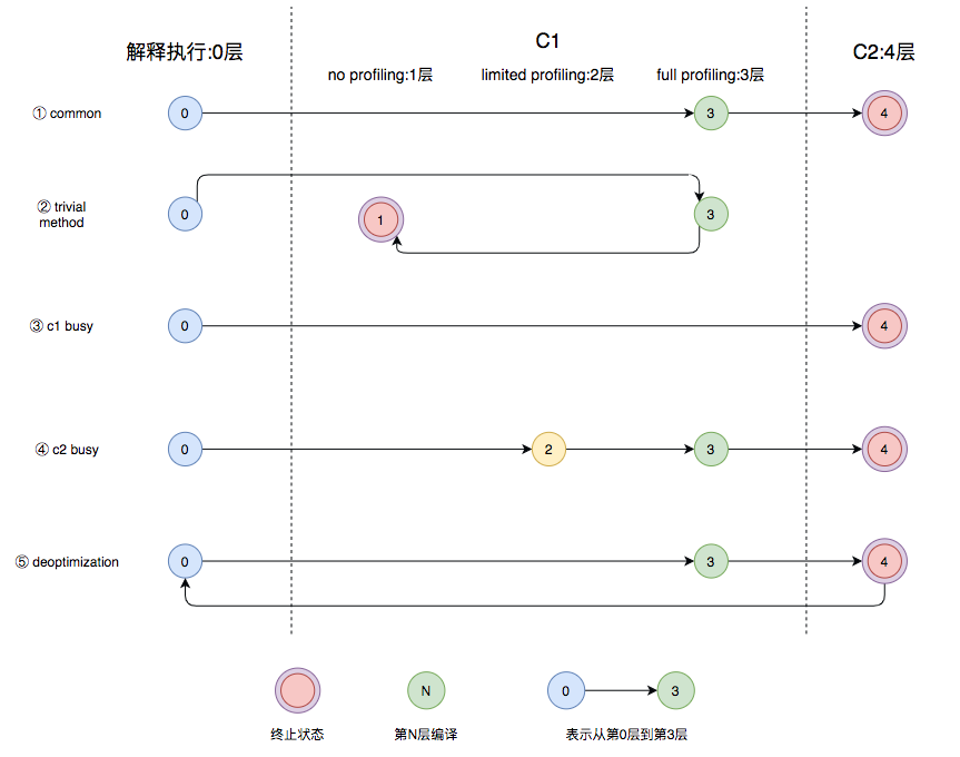 4)C1 中的执行效率是 1 层>2 层>3 层,第 3 层一般要比第 2 层慢 35%以上,所以在 C2 忙碌的情况下,执行图中第 ④ 条路径。这时方法会被 2 层的 C1 编译,然后再被 3 层的 C1 编译,以减少方法在 3 层的执行时间。