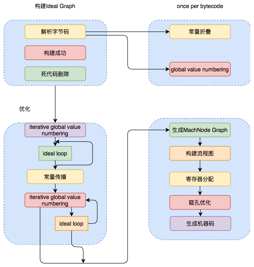 解析字节码的时候,C2 会向一个空的 Graph 中添加节点,Graph 中的节点通常对应一个指令块,每个指令块包含多条相关联的指令,JVM 会利用一些优化技术对这些指令进行优化,比如 Global Value Numbering、常量折叠等,解析结束后,还会进行一些死代码剔除的操作。