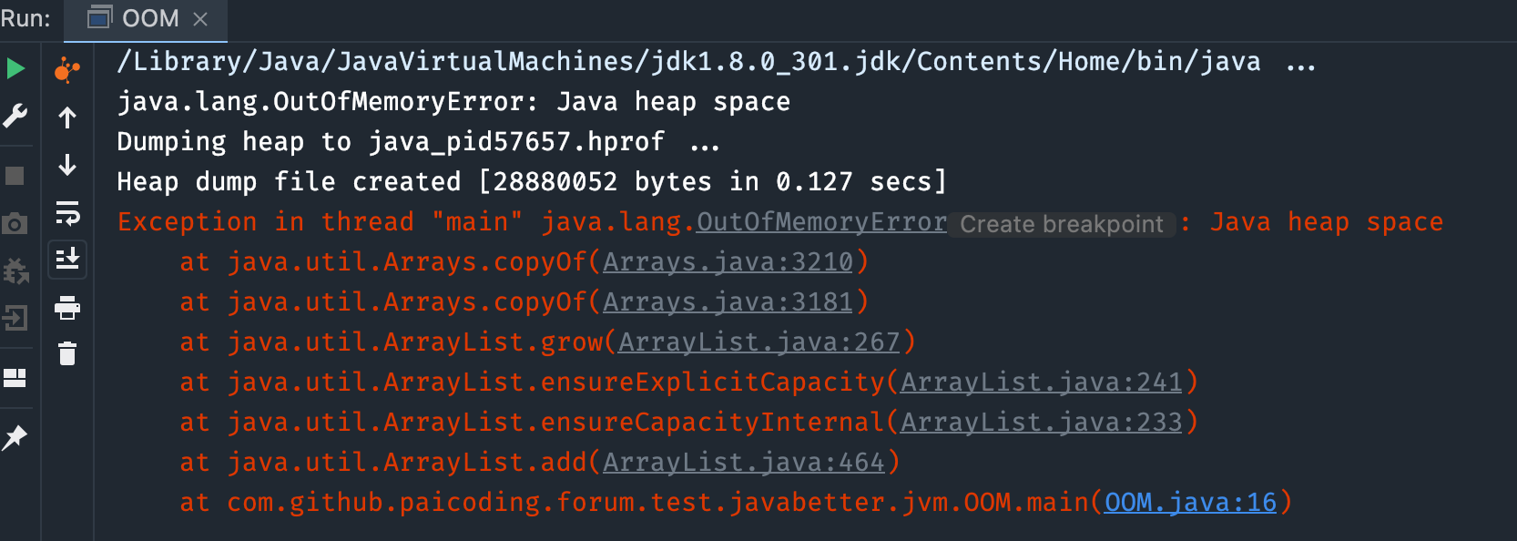 }运行程序的时候记得设置一下 VM 参数:-Xms20m -Xmx20m -XX:+HeapDumpOnOutOfMemoryError,限制堆内存大小为 20M,并且不允许扩展,并且当发生 OOM 时 dump 出当前内存的快照。