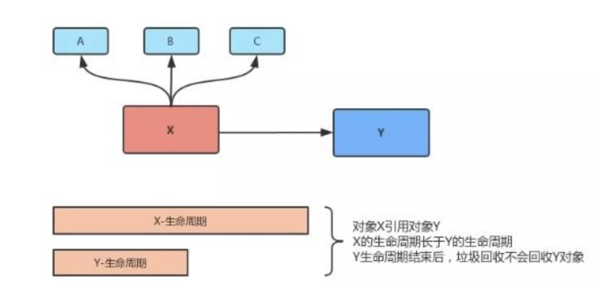 在上图中:对象 X 引用对象 Y,X 的生命周期比 Y 的生命周期长,Y 生命周期结束的时候,垃圾回收器不会回收对象 Y。