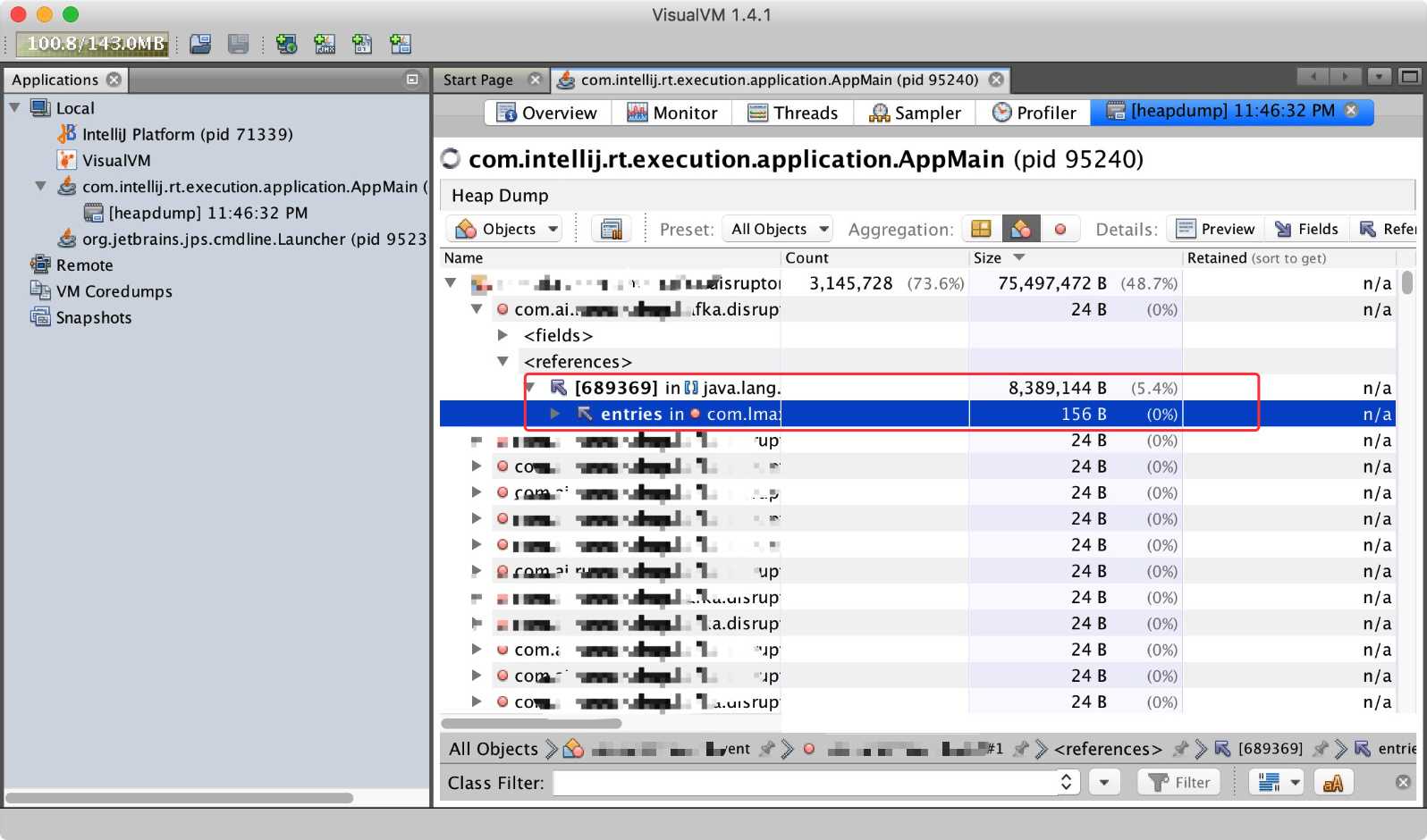 结果发现 com.lmax.disruptor.RingBuffer 类型的对象占用了将近 50% 的内存。