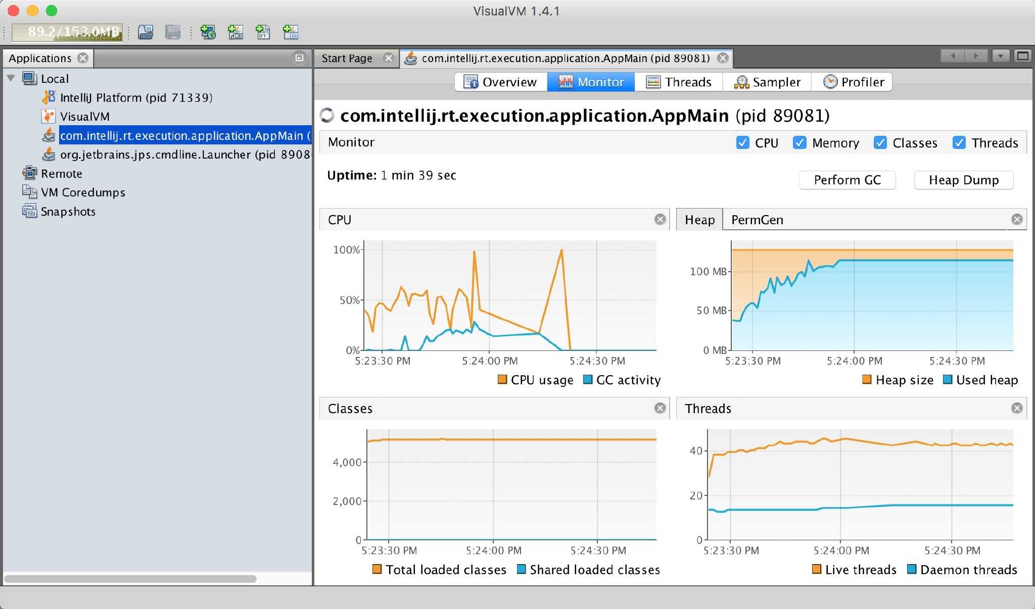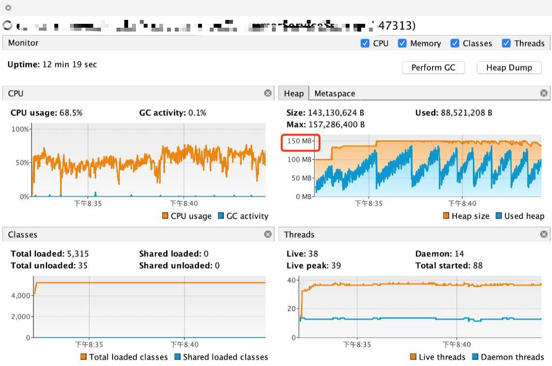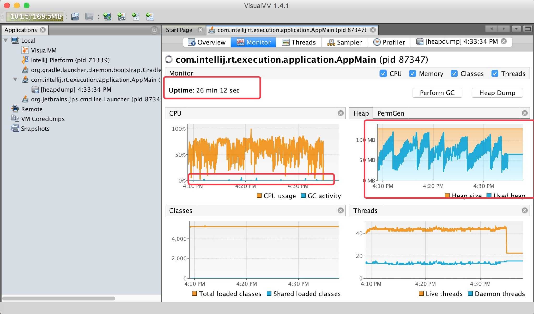 同时当应用启动之后利用 VisualVM 连上应用实时监控内存、GC 的使用情况。