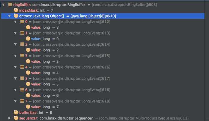 我设置队列大小为 8 ,从 0~9 往里面写 10 条数据,当写到 8 的时候就会把之前 0 的位置覆盖掉,后面的以此类推(类似于 HashMap 的取模定位)。