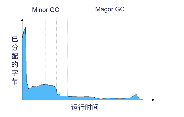 来看个例子吧。下图中,竖轴代表已分配的字节,而横轴代表程序的运行时间。