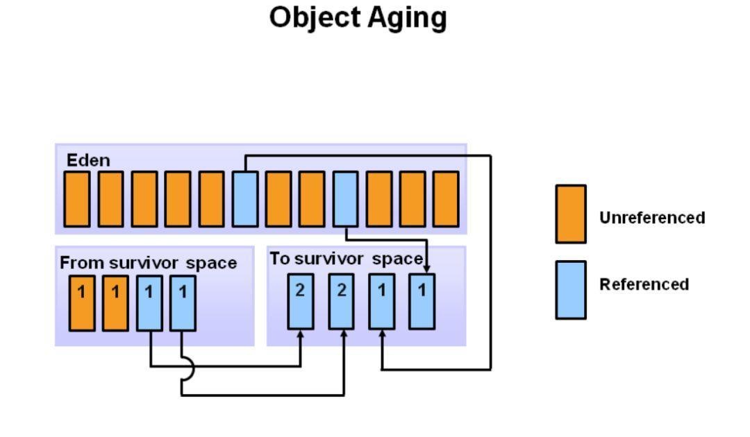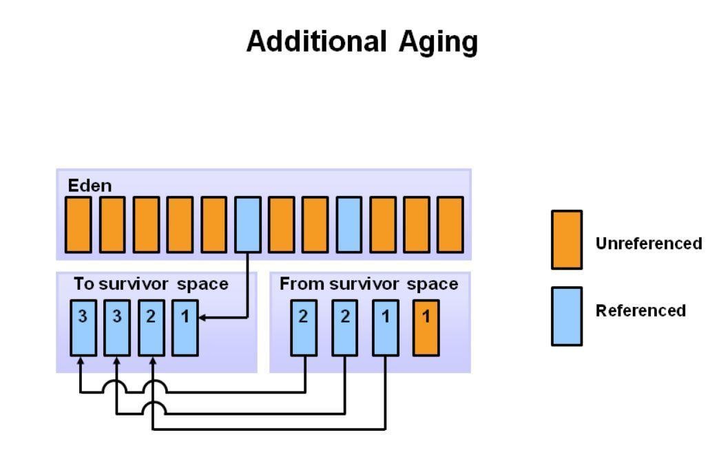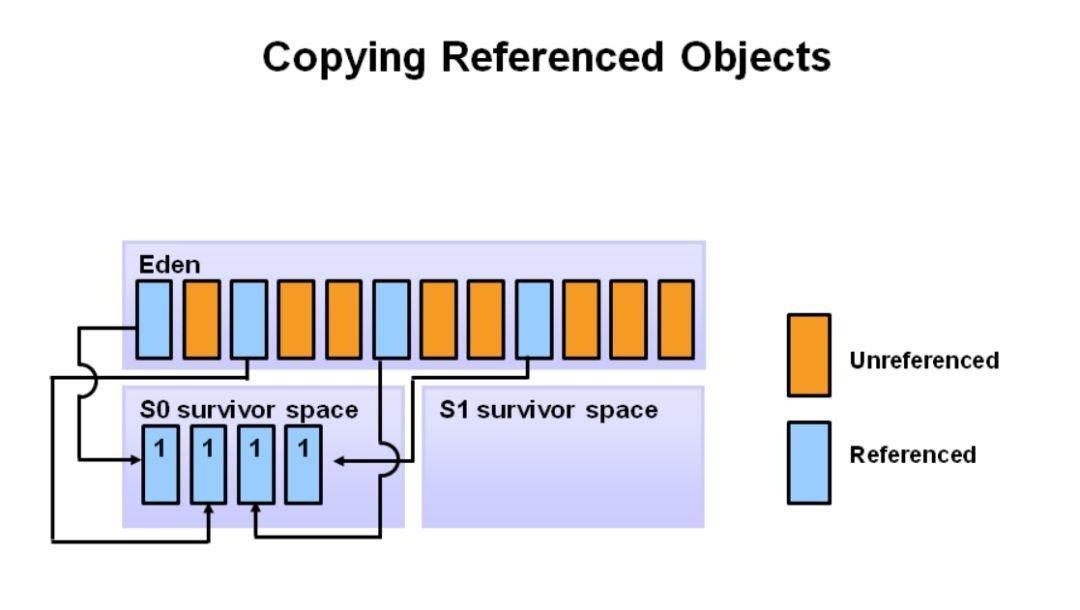 引用的对象被移动到第一个 survivor 空间。 清除 eden 空间时,将删除未引用的对象。
