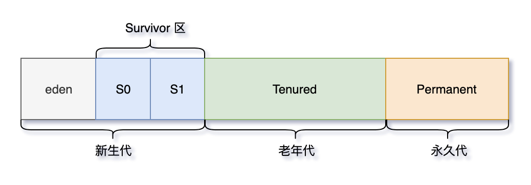 根据之前的规律,就可以用来提升 JVM 的效率了。方法是,把堆分成几个部分(就是所谓的分代),分别是新生代、老年代,以及永生代。