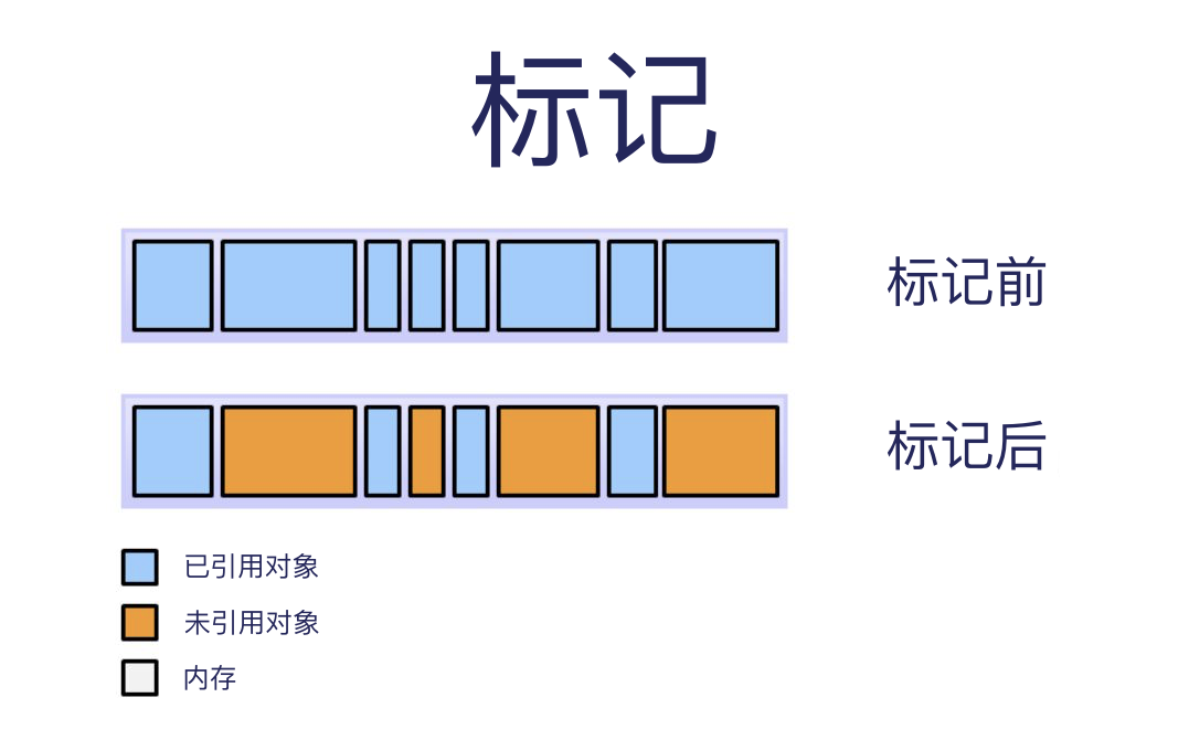 垃圾回收的第一步是标记。垃圾回收器此时会找出内存哪些在使用中,哪些不是。