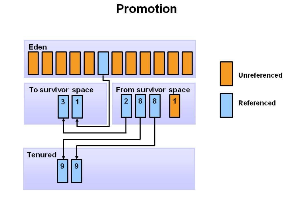此幻灯片演示了 promotion。 在较小的GC之后,当老化的物体达到一定的年龄阈值(在该示例中为8)时,它们从年轻一代晋升到老一代。