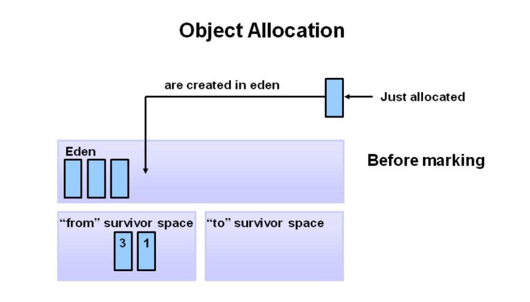 首先,将任何新对象分配给 eden 空间。 两个 survivor 空间都是空的。